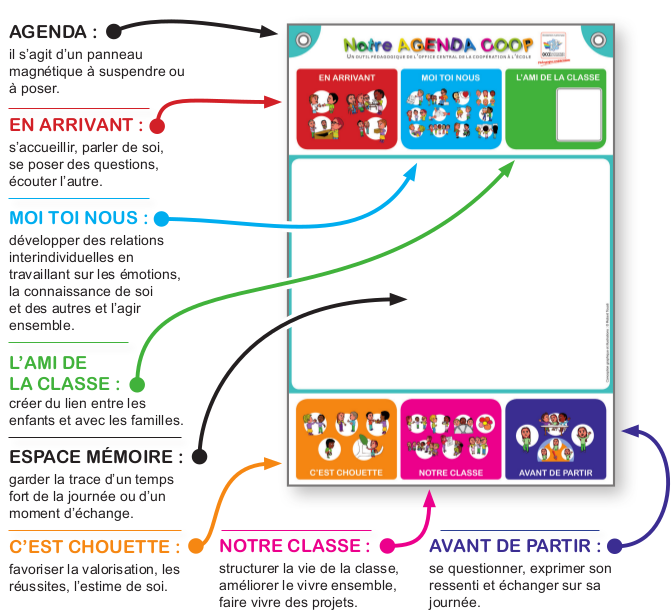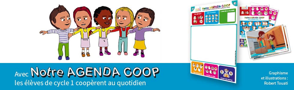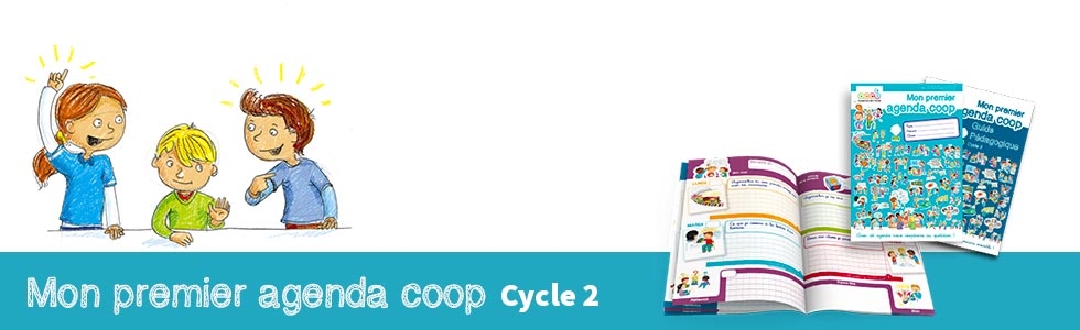 L'agenda coop est un outil pédagogique illustré dans lequel, chaque jour, les enfants découvrent une question et une activité pour apprendre à se connaître et s'estimer, aller vers les autres et mieux les respecter. L'agenda coop, c'est :
